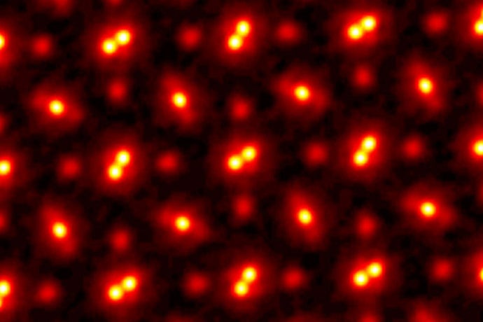 Image shows an electron ptychographic reconstruction of a praseodymium orthoscandate (PrScO3) crystal, zoomed in 100 million times. Credit: Cornell University